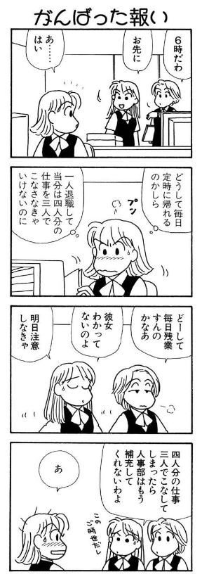人手不足を挽回しようと頑張って無理して仕事をこなすと、他者からは「人手が足りてる」と判断されて、人手の補充をしてもらえなくなる、というパラドックスがこのマンガでは上手く描かれています。